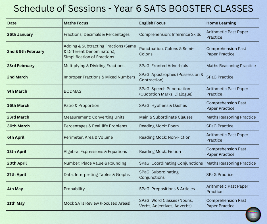 I provide 1-hour group sessions for Year 5 and 6 students, combining maths and English. These sessions are designed to be affordable, engaging, and to cover a wide range of content from the National Curriculum. We alternate between maths and English to keep students engaged and to cover a variety of topics in one session.